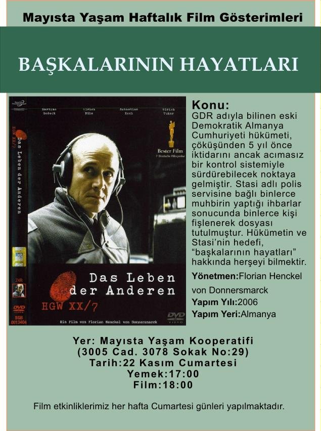 Ümraniye Mayısta Yaşam’da, her Cumartesi yaptığımız film gösterimlerimiz devam ediyor. Bu hafta “Başkalarının Hayatları” adlı filmi izleyeceğiz.